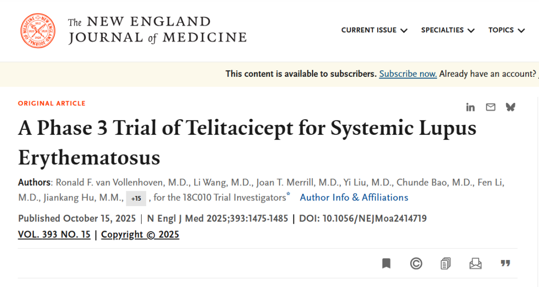 10月16日,榮昌生物宣布,泰它西普治療系統(tǒng)性紅斑狼瘡(SLE)的中國Ⅲ期臨床研究成果,重磅發(fā)表于國際頂級醫(yī)學期刊《新英格蘭醫(yī)學雜志》(NEJM)。